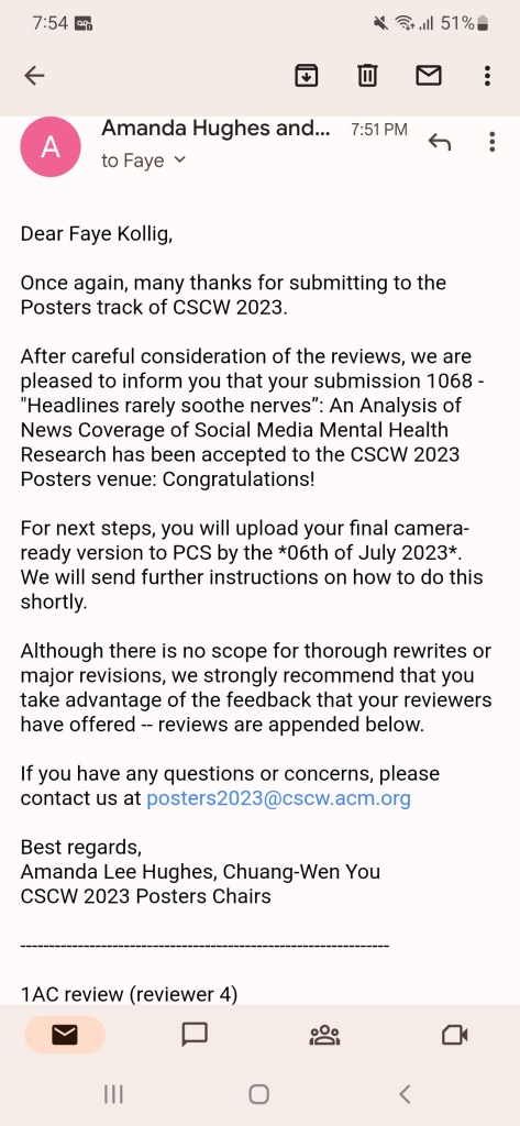 - Got my first first-author publication, which was a poster in CSCW 2023, which I got to present in person!